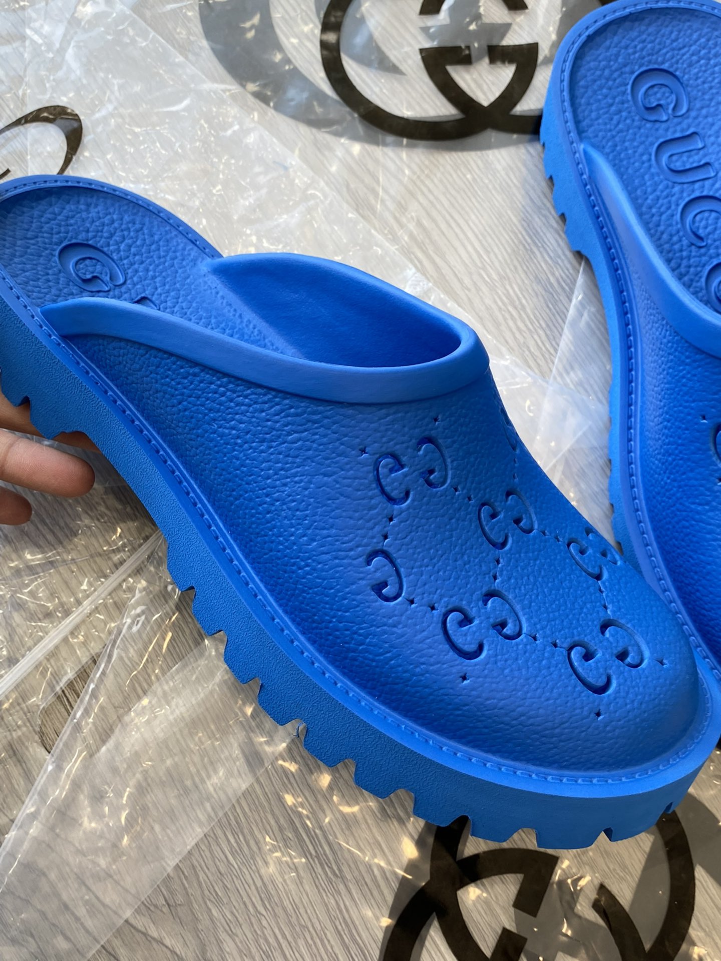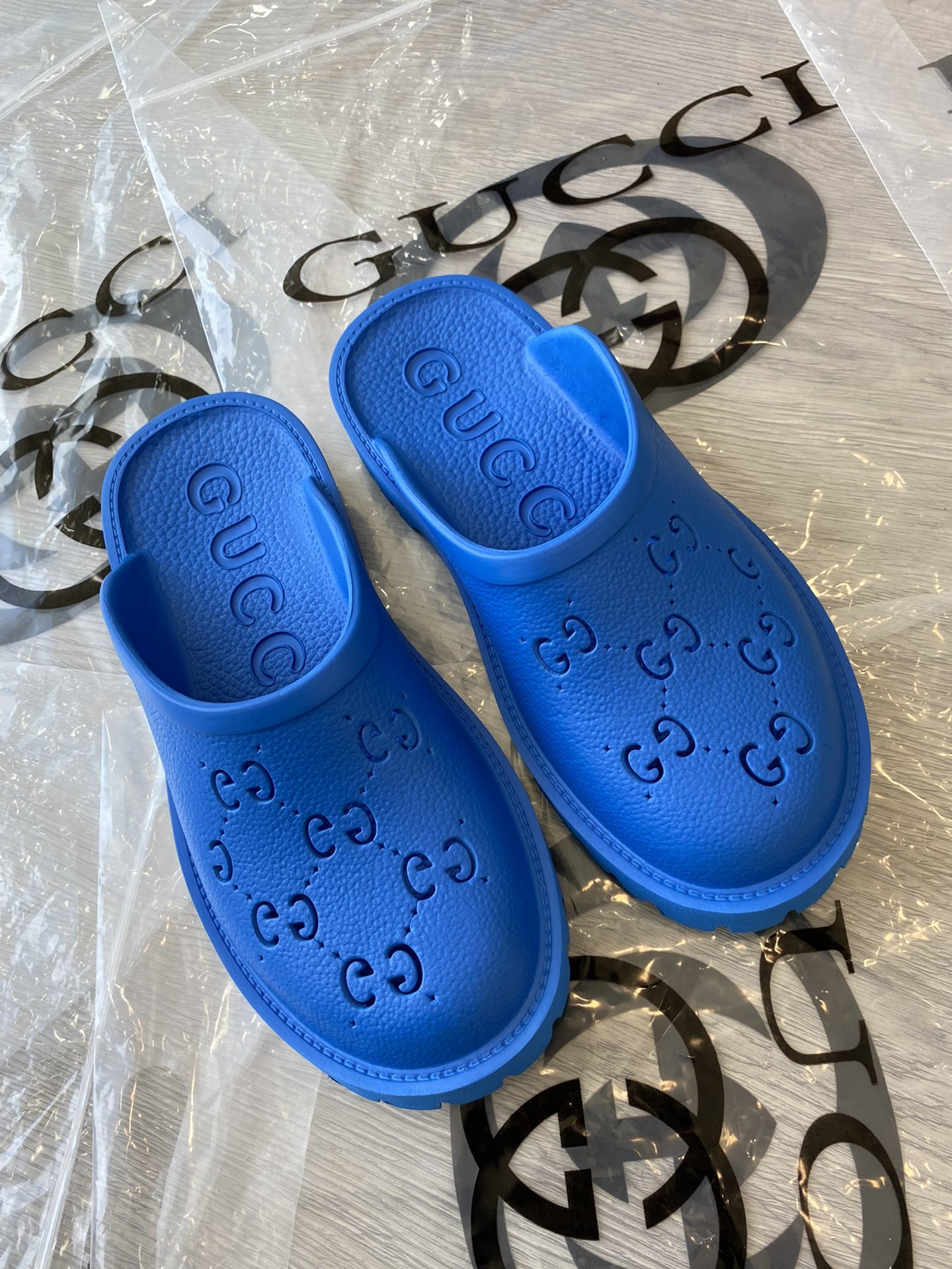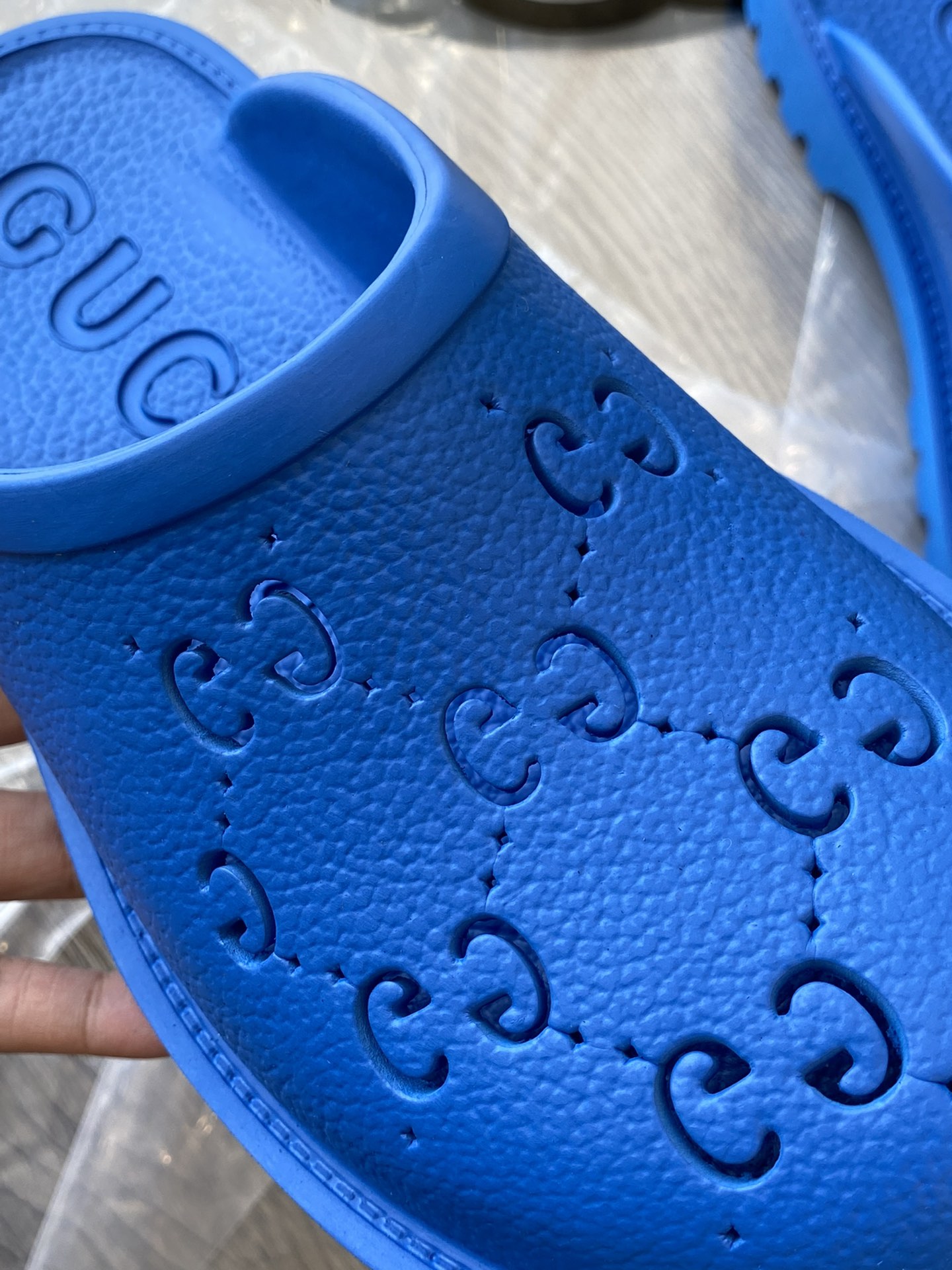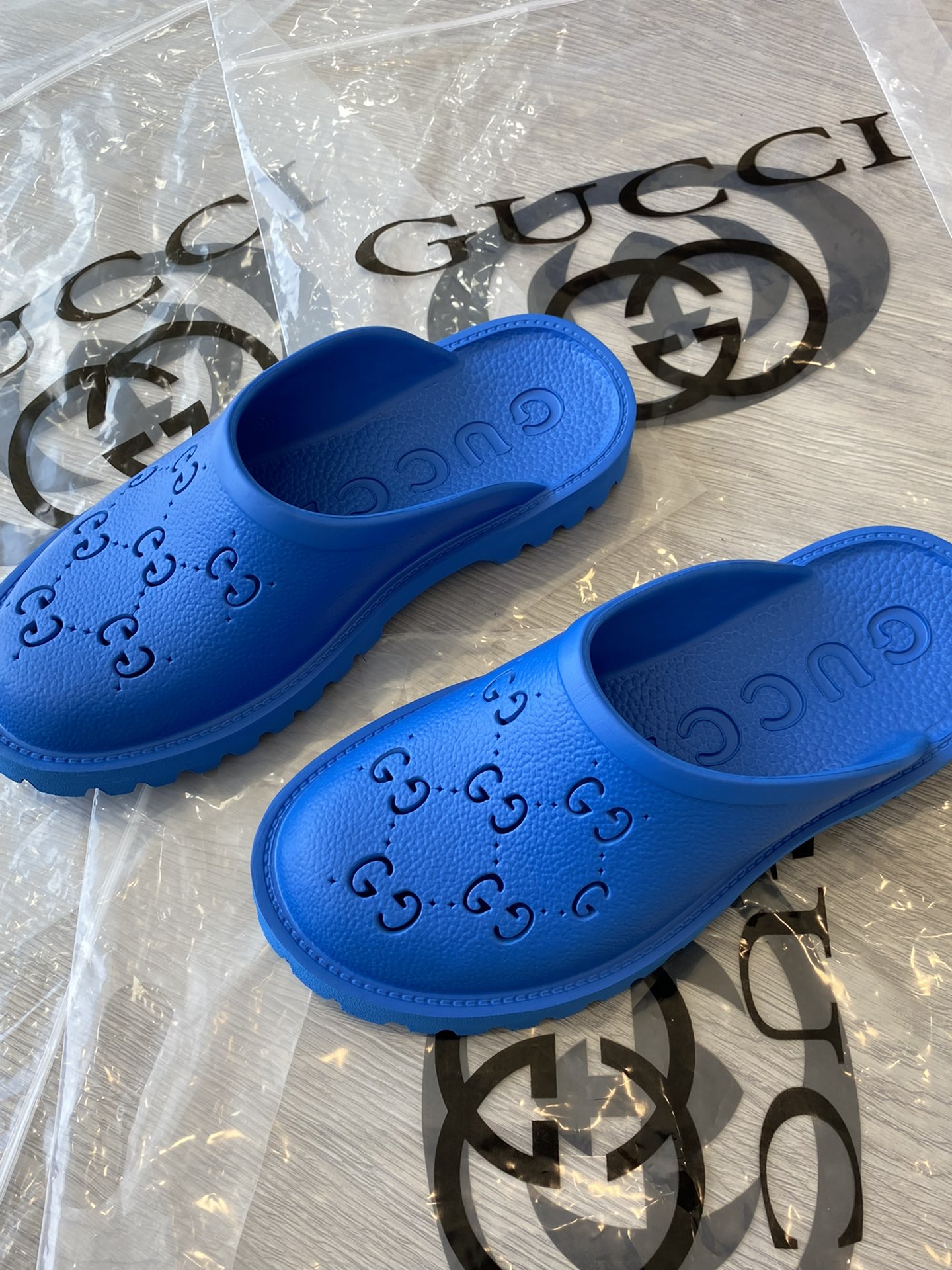 Tags: Gucci slip-on sandal Royal Blue perforated GG rubber