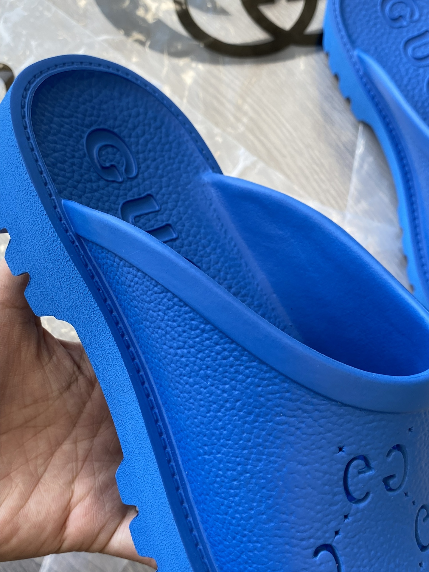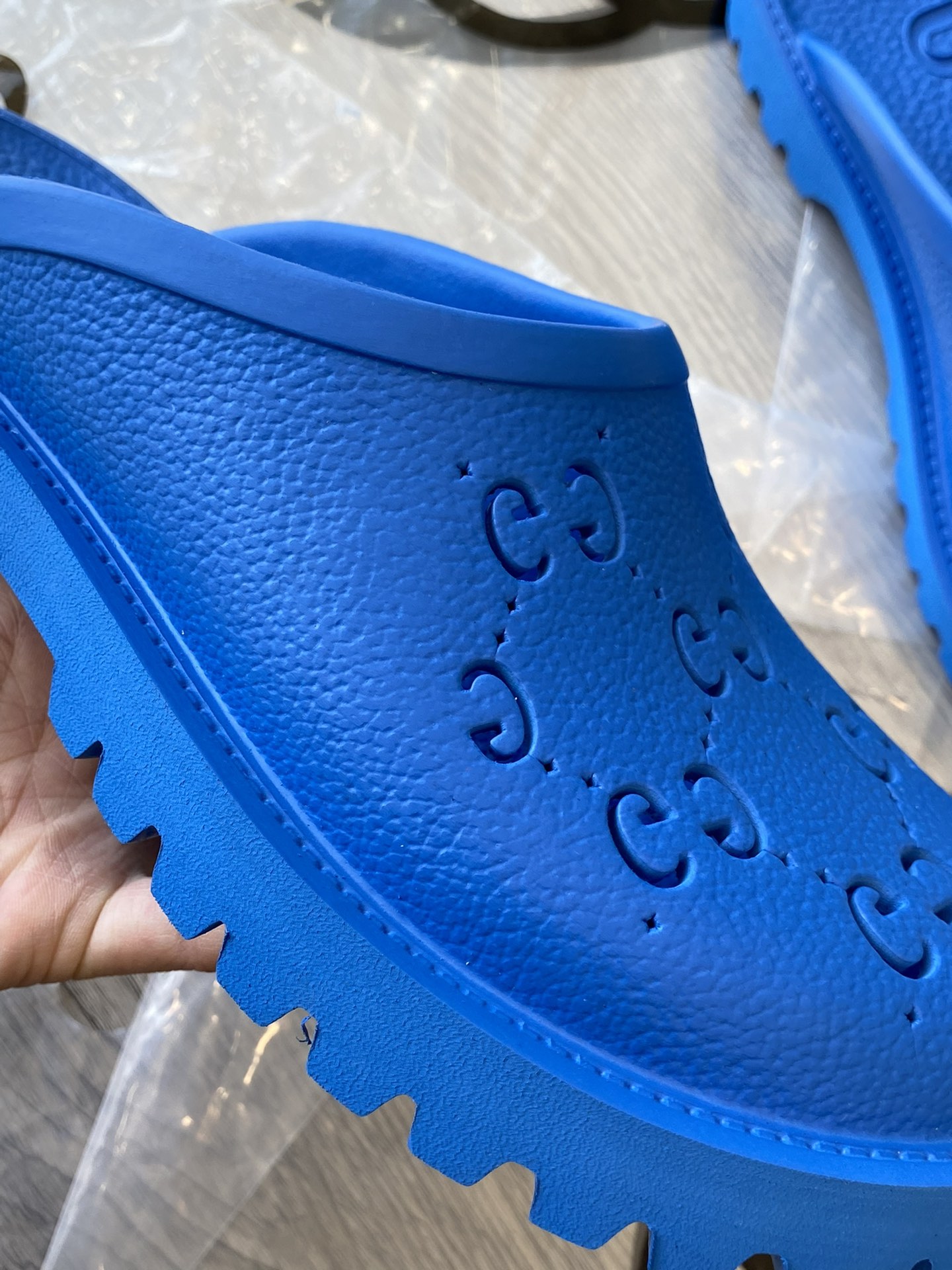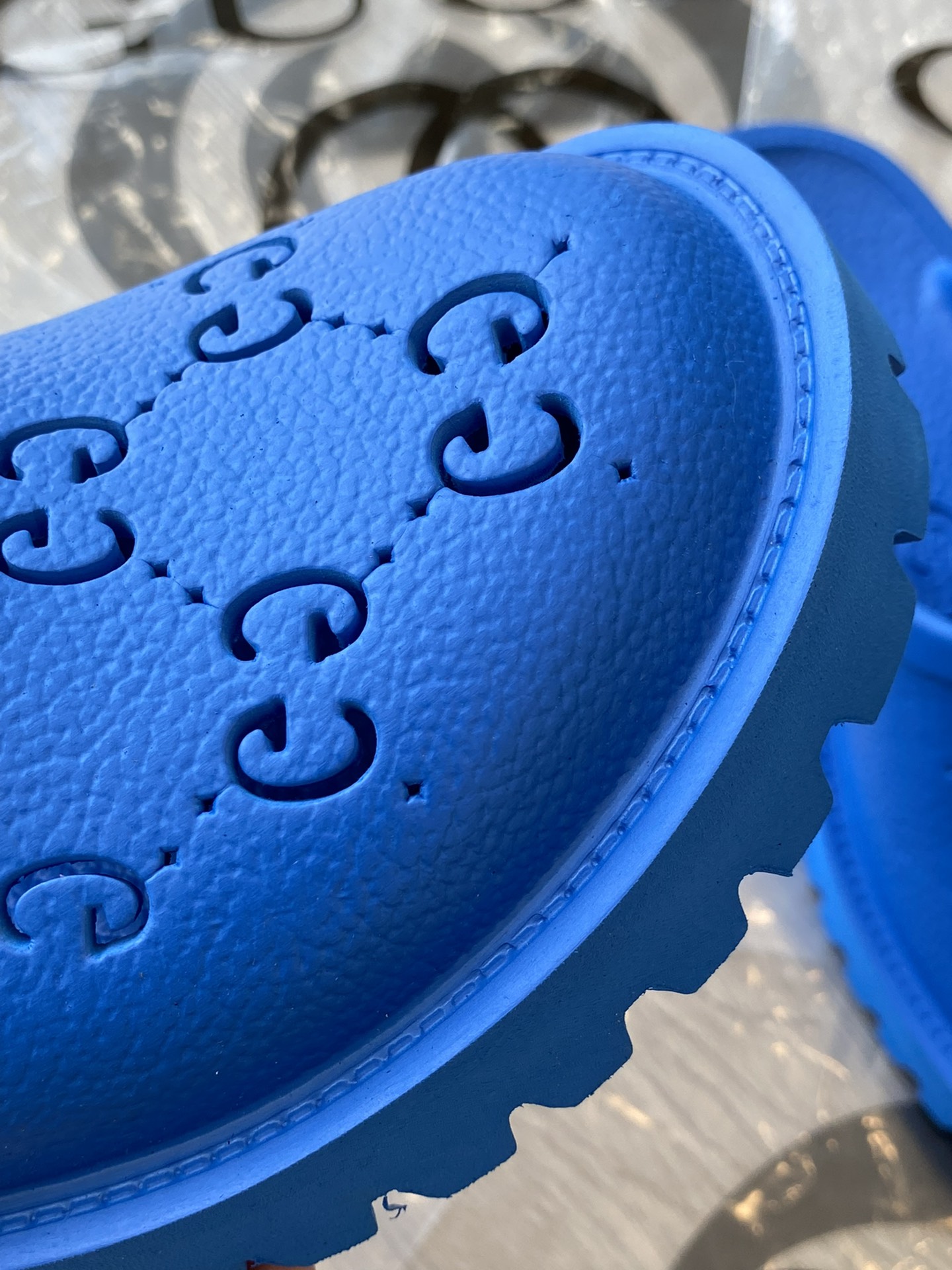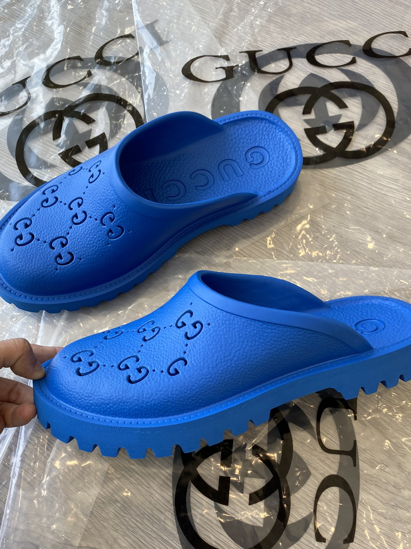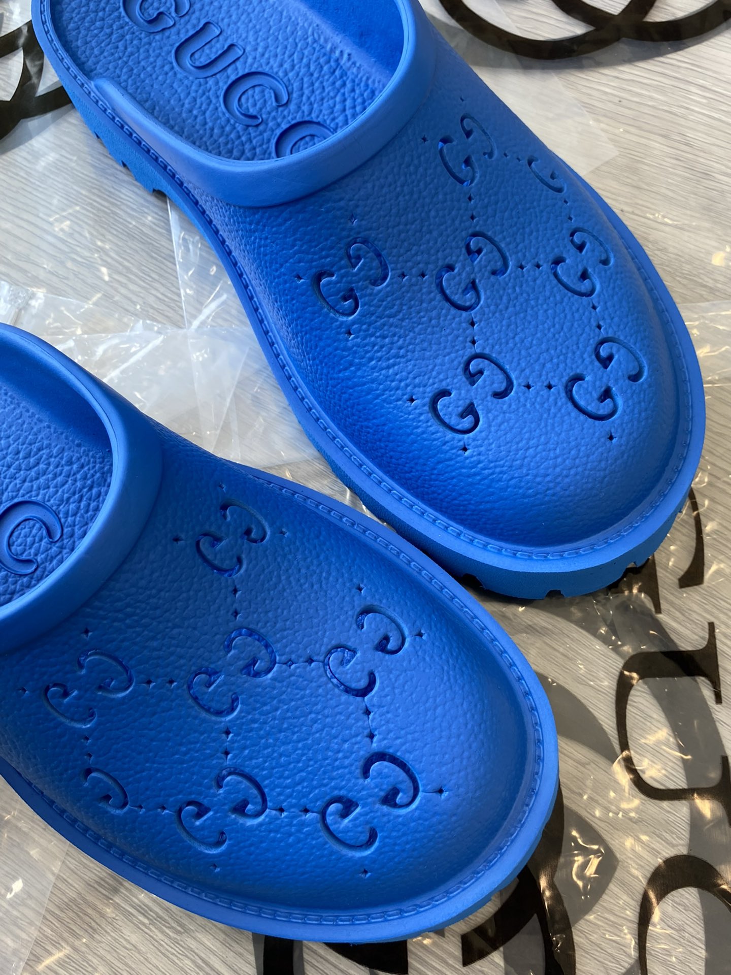 Tags: Gucci slip-on sandal Royal Blue perforated GG rubber
